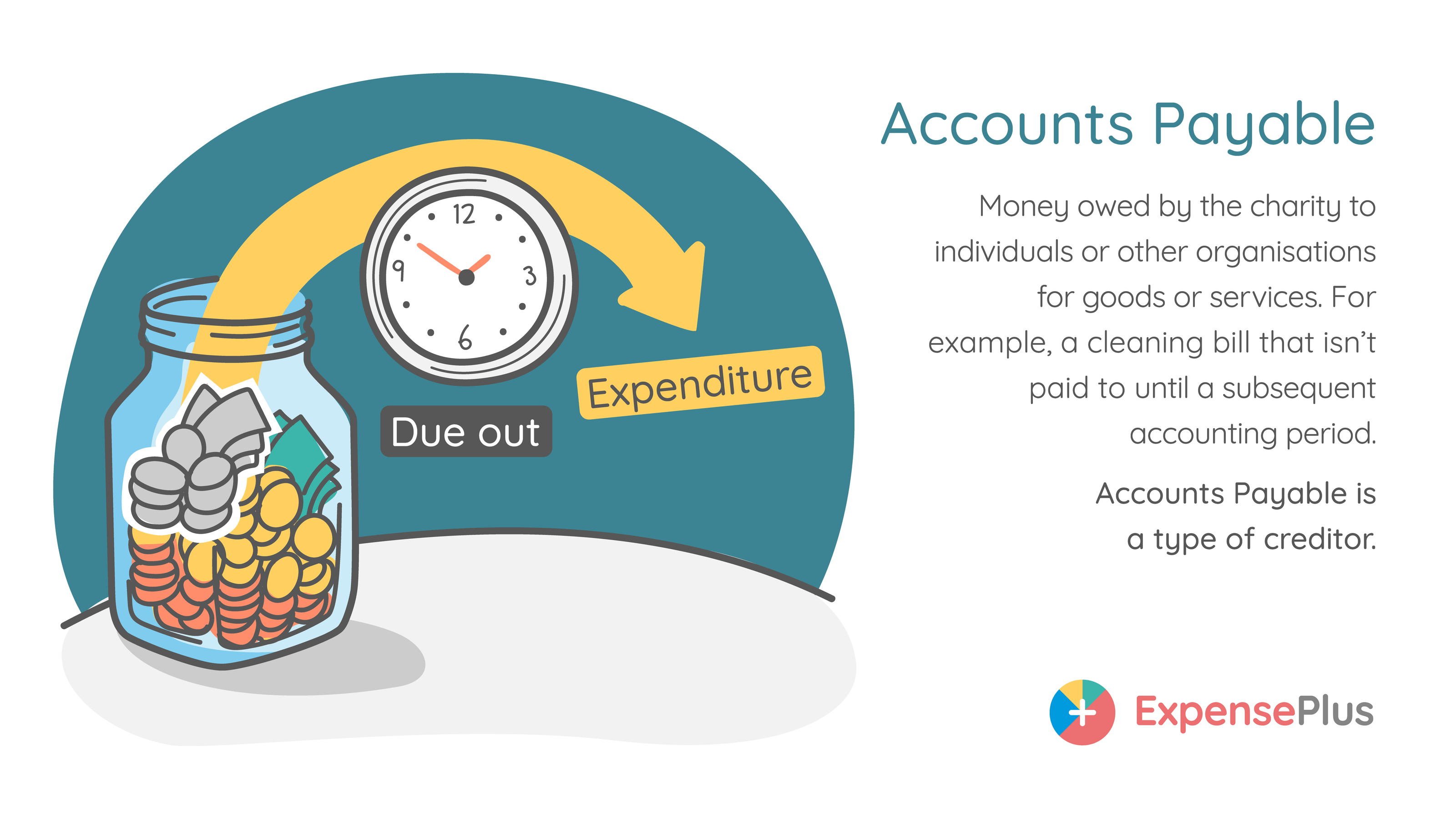 Money owed by the charity to individuals or other organisations for goods or services. For example, a cleaning bill that isn't paid until a subsequent accounting period. Accounts Payable is a type of creditor.