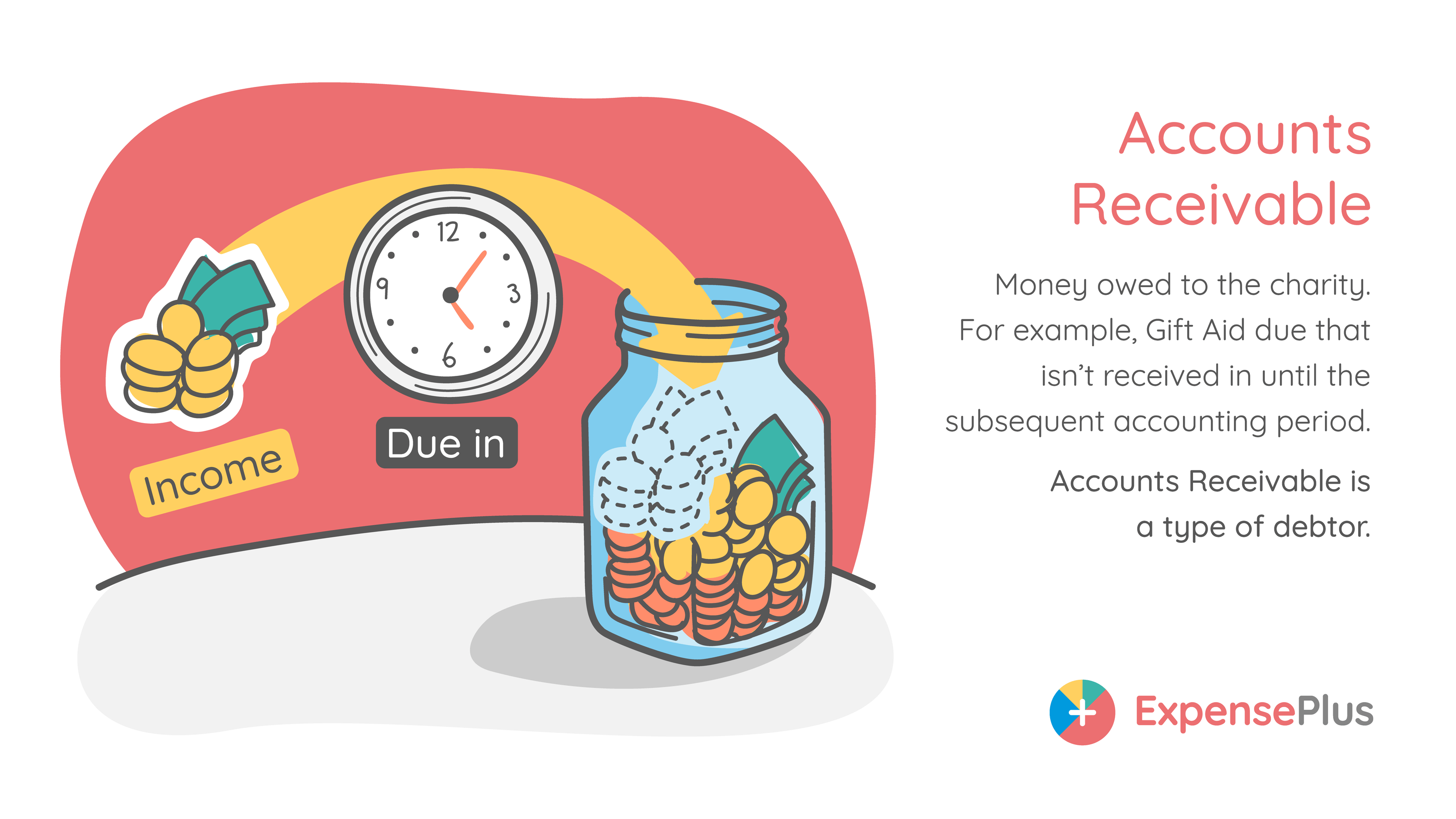 Money owed to the charity. For example, Gift Aid due that isn't received in until the subsequent accounting period. Accounts Receivable is a type of debtor.