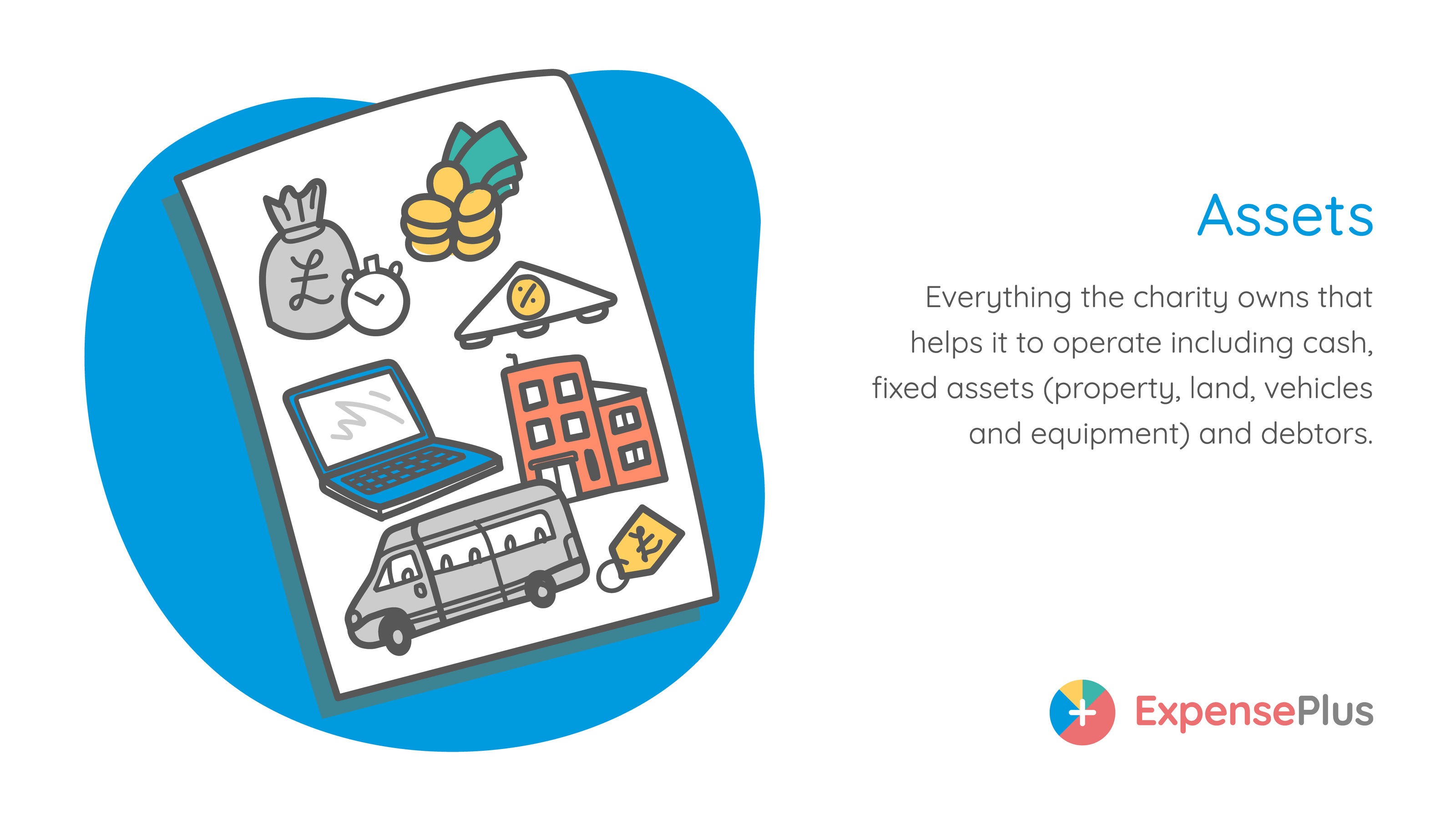 Everything the charity owns that helps it to operate including cash, fixed assets (property, land, vehicles and equipment) and debtors.
