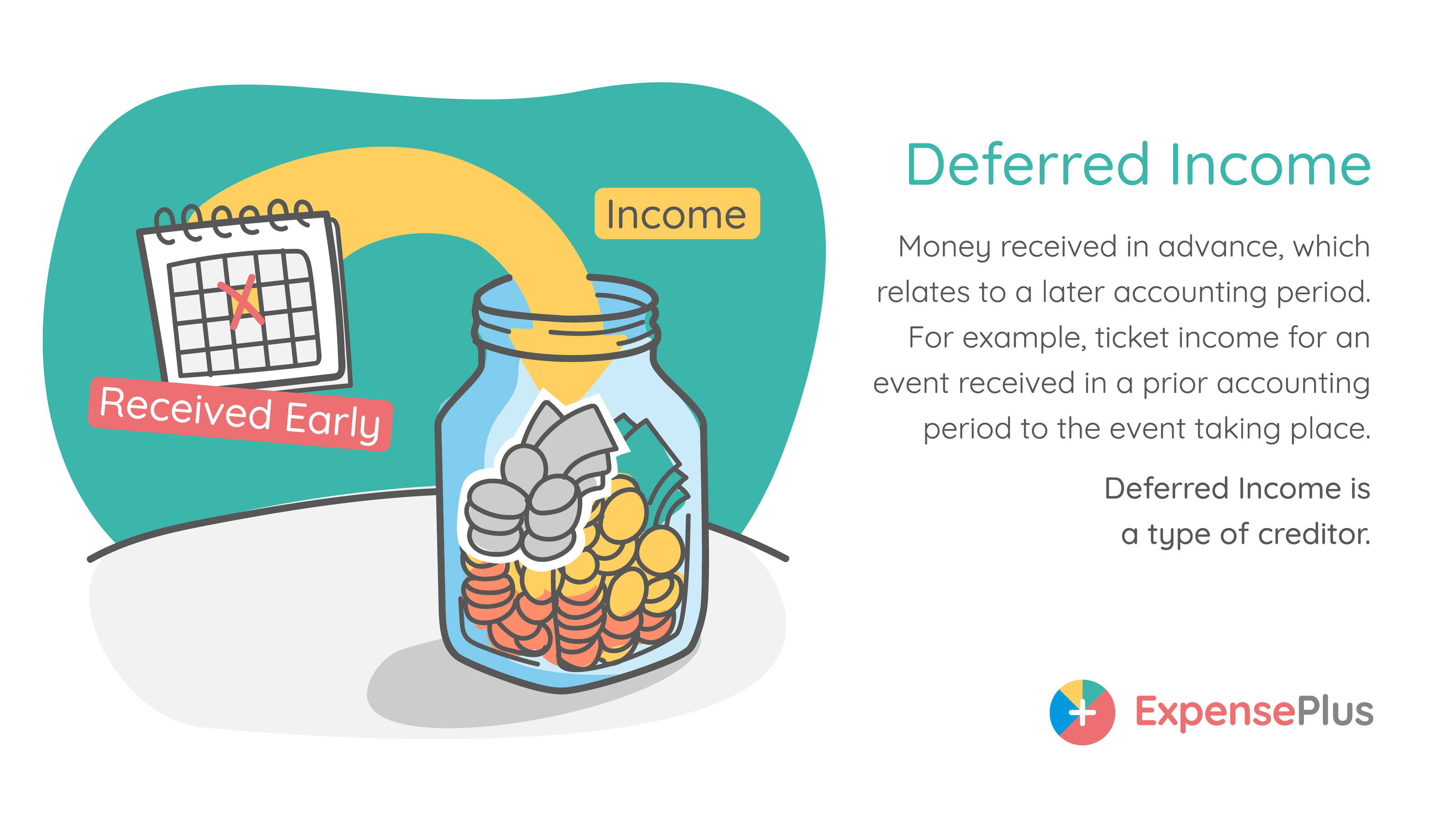 Money received in advance, which relates to a later accounting period. For example, ticket income for an event received in a prior accounting period to the event taking place. Deferred Income is a type of creditor.