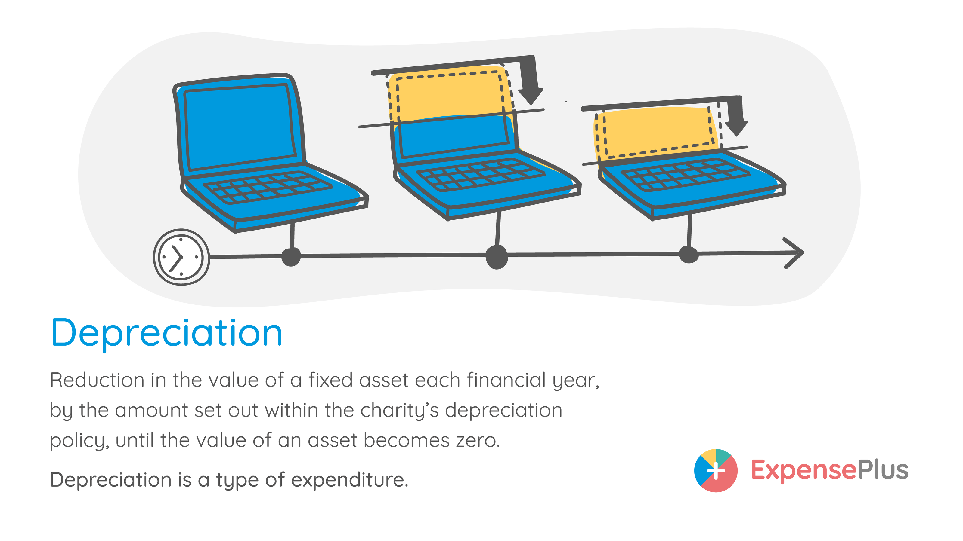 Reduction in the value of a fixed asset each financial year, by the amount set out within the charity's depreciation policy, until the value of an asset becomes zero. Depreciation is a type of expenditure.