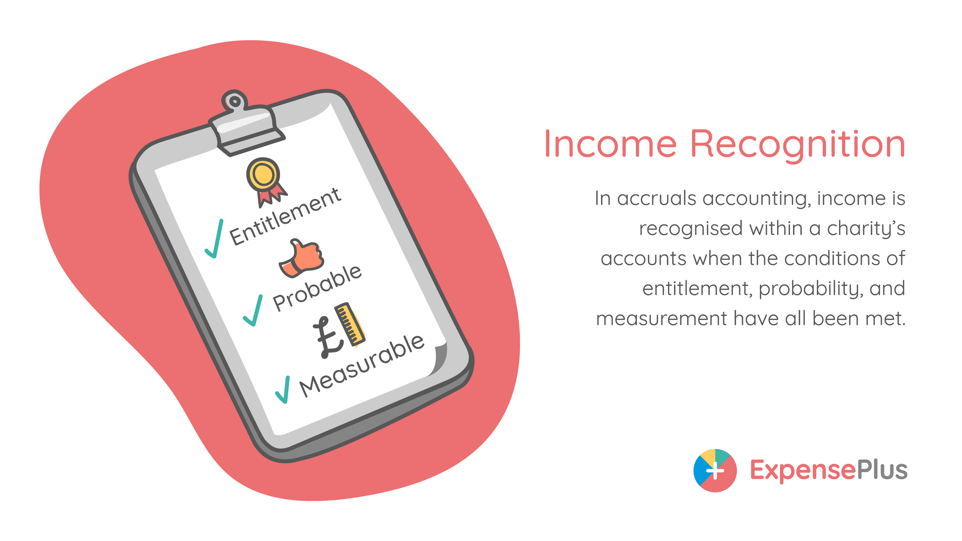 In accruals accounting, income is recognised within a charity's accounts when the conditions of entitlement, probability, and measurement have all been met.