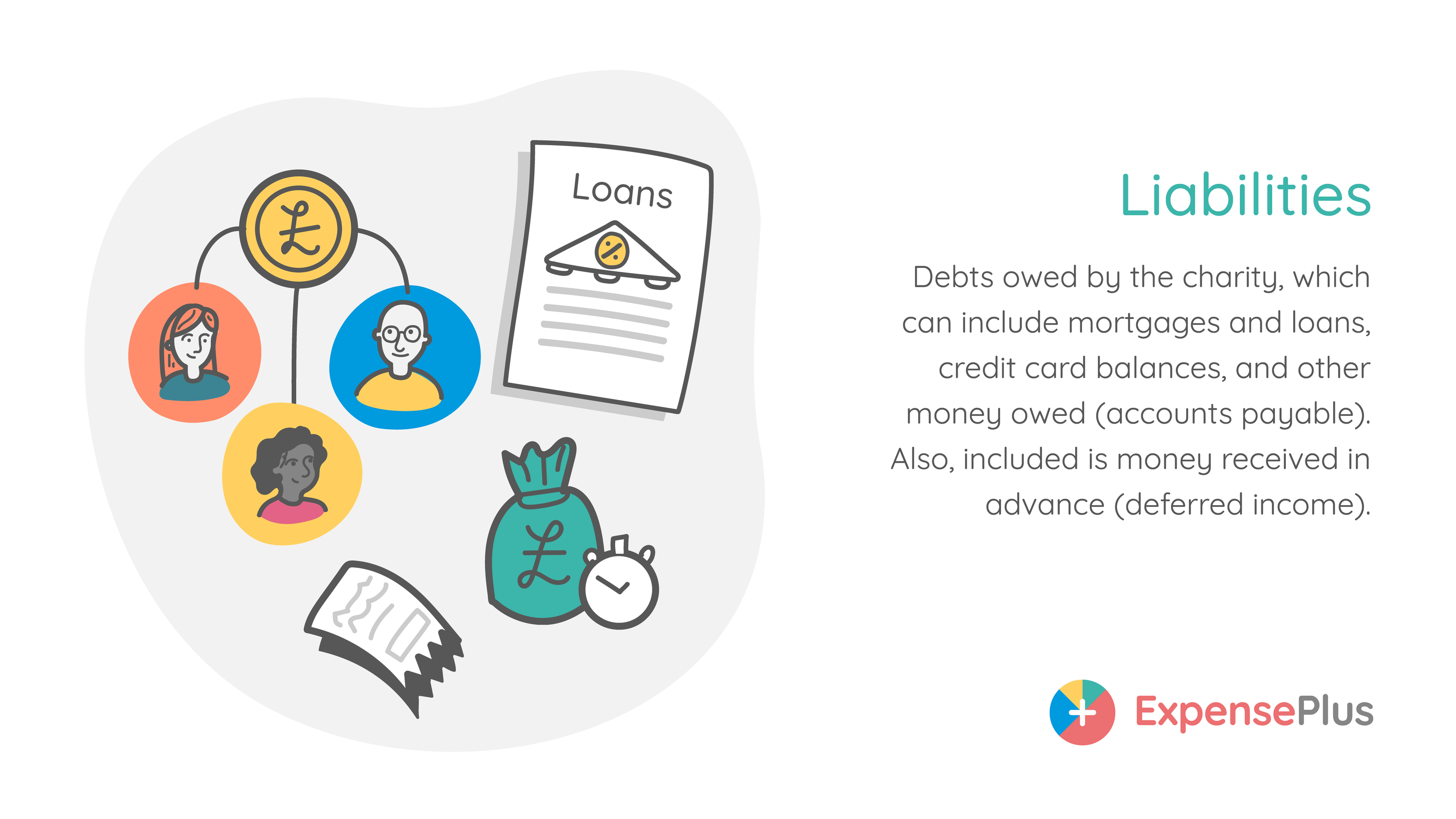 Debts owed by the charity, which can include mortgages and loans, credit card balances, and other money owed (accounts payable). Also included is money received in advance (deferred income).