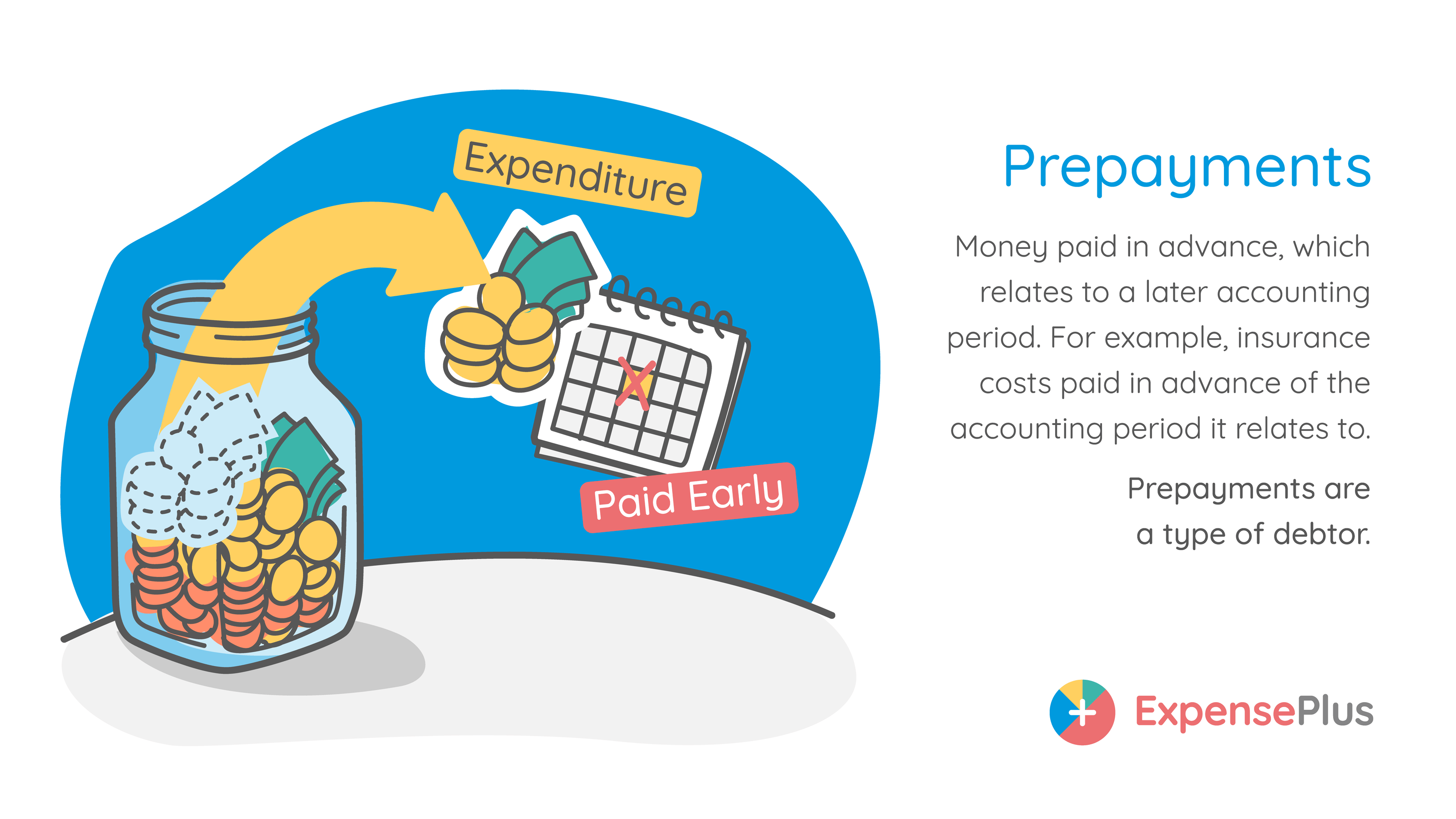 Money paid in advance, which relates to a later accounting period. For example, insurance costs paid in advance of the accounting period it relates to. Prepayments are a type of debtor.